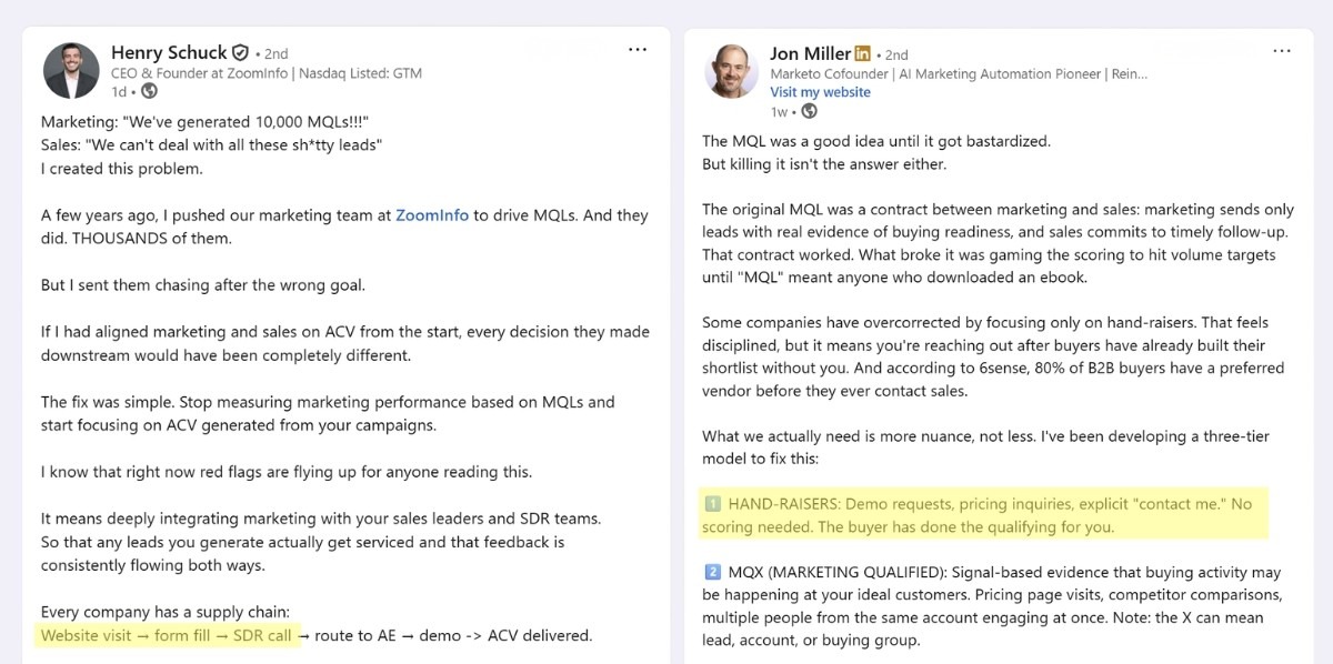 Jon Miller has proposed a tiered model where hand-raisers (demo requests, pricing inquiries, contact forms) sit at the top because, as he puts it, "the buyer has done the qualifying for you."